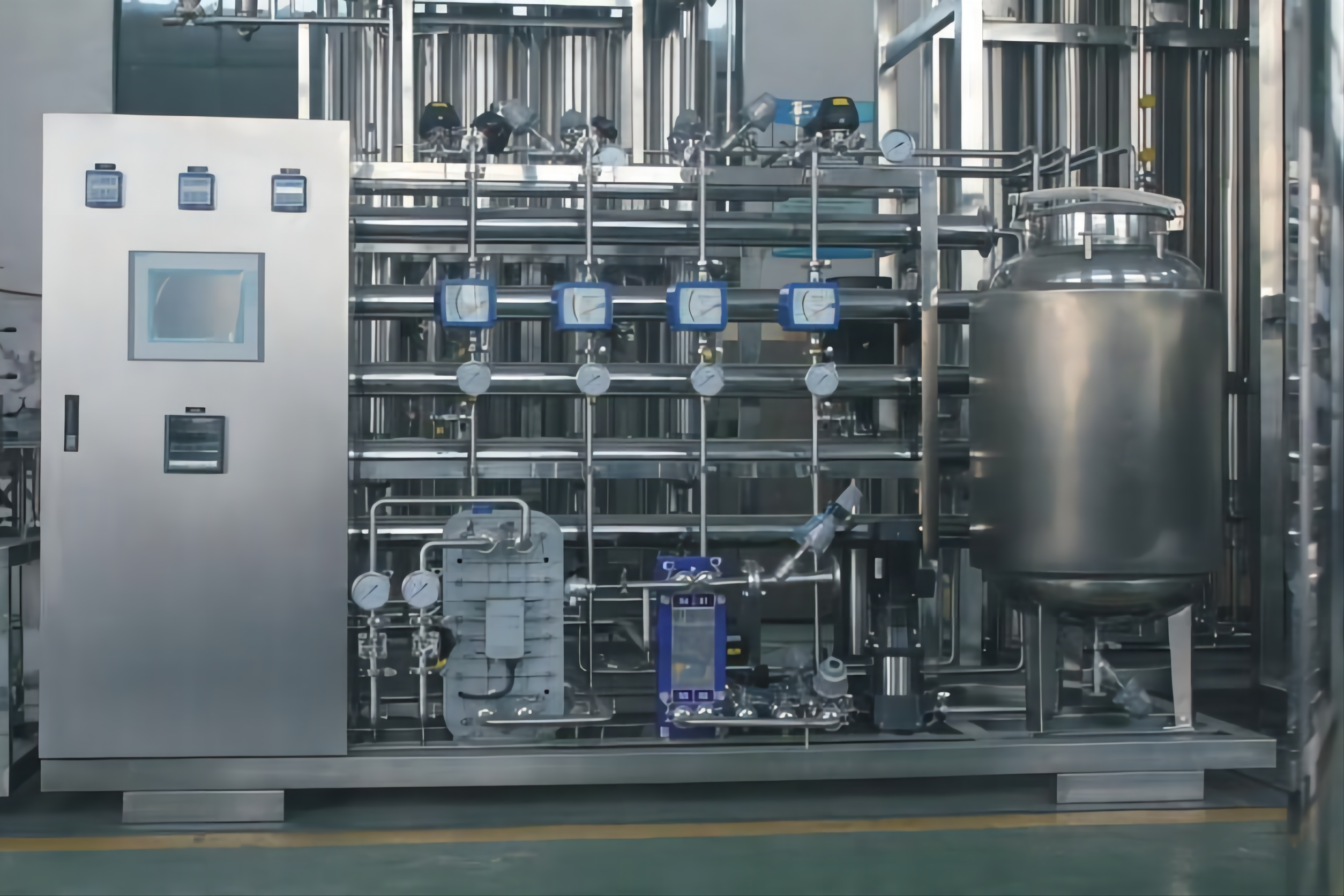 ②工藝:預處理系統→一級高壓泵→一級RO反滲透→級間純水箱→二級高壓泵→二級RO反滲透→二級純水箱→EDI輸送泵→EDI電除鹽系統→無菌純水箱。