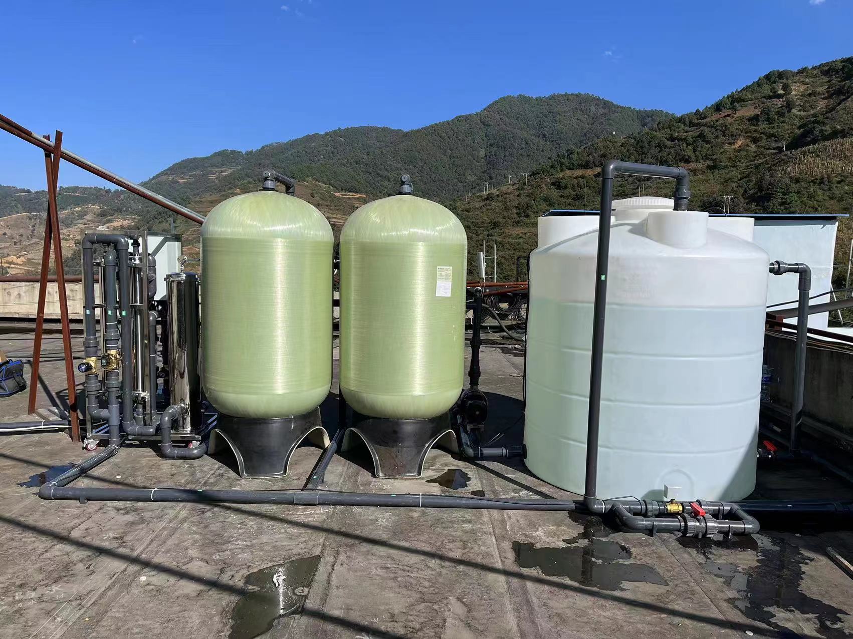 工藝流程:進(jìn)水→原水箱→原水輸送泵→多介質(zhì)過濾器→活性炭過濾器→精密過濾器→超濾過濾裝置(產(chǎn)水量≧10T/H)→超濾水箱→出水口。