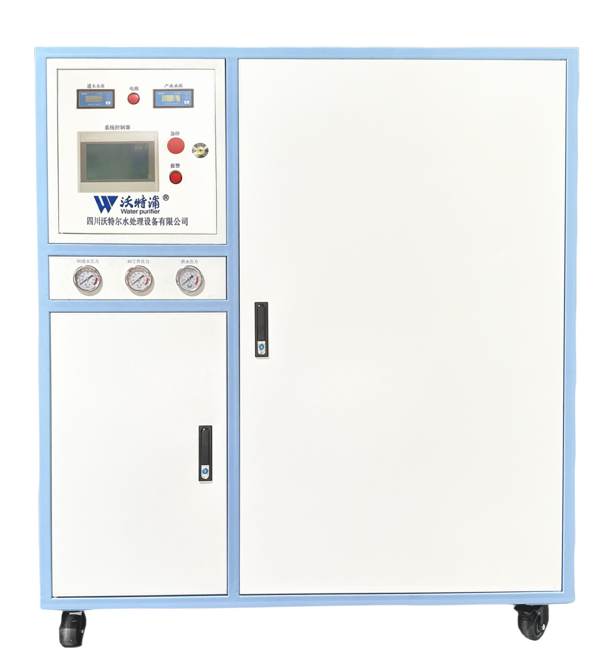 全觸摸彩屏操作系統,采用知名PLC模塊自主編程控制,實時顯示水質、系統狀態和報警信息;